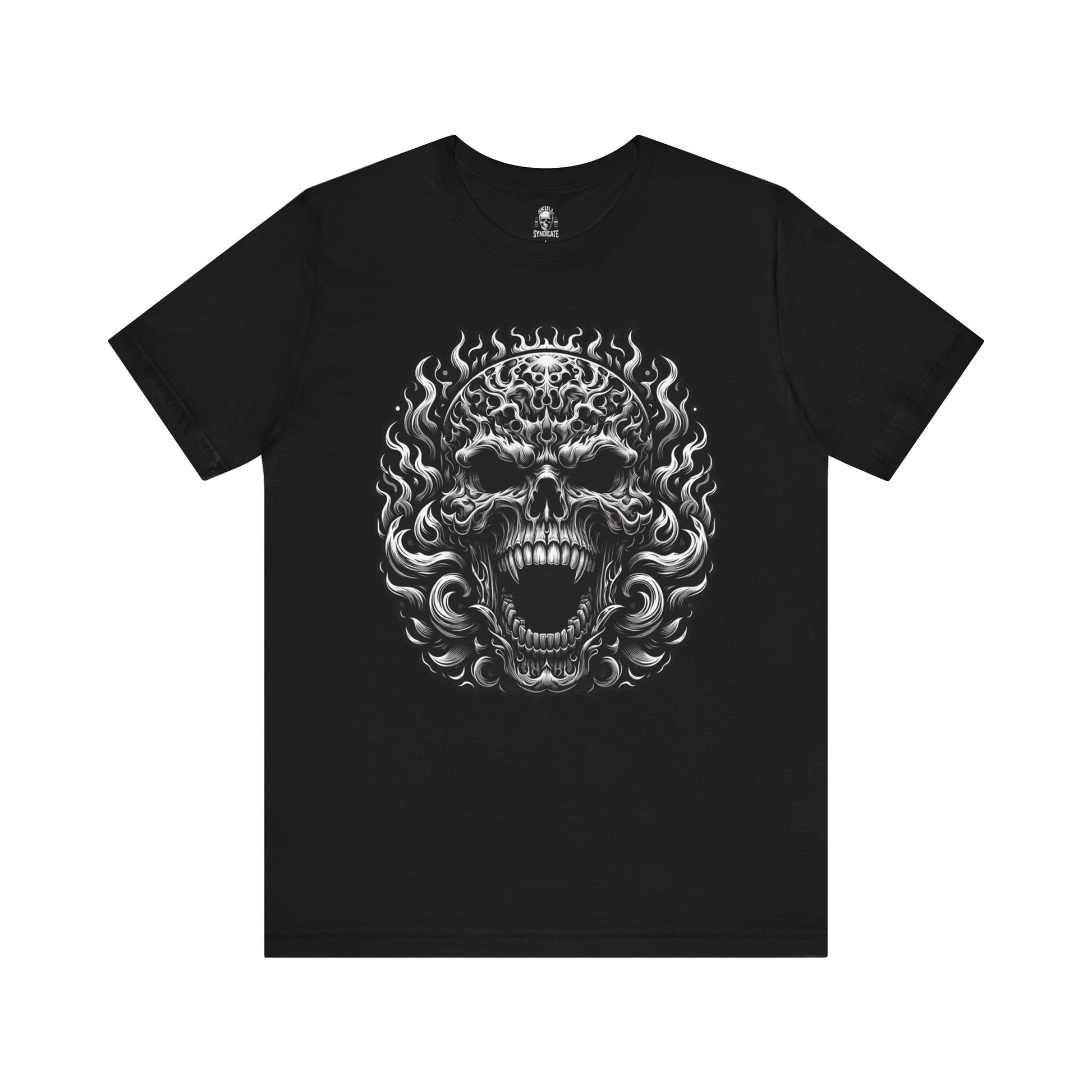 Unleash your wrath with our meticulous, master illustrator designed skull t-shirt. The stark black and white design recounts tales of fury and anger through every menacing detail. The skull, seemingly on fire and screaming into oblivion, becomes a beacon of rebellion against the ordinary. Crafted without shading, the solid black backdrop starkly contrasts the skull, creating a visually striking appearance. This design, perfect for skull enthusiast, ensures the essence of macabre is never lost. #skulldesign #skullsyndicate #wrath #punkfashion #rebelwear #flamefantasy #darkaesthetic #screamingstares #ruthlessrage #apparelobsession