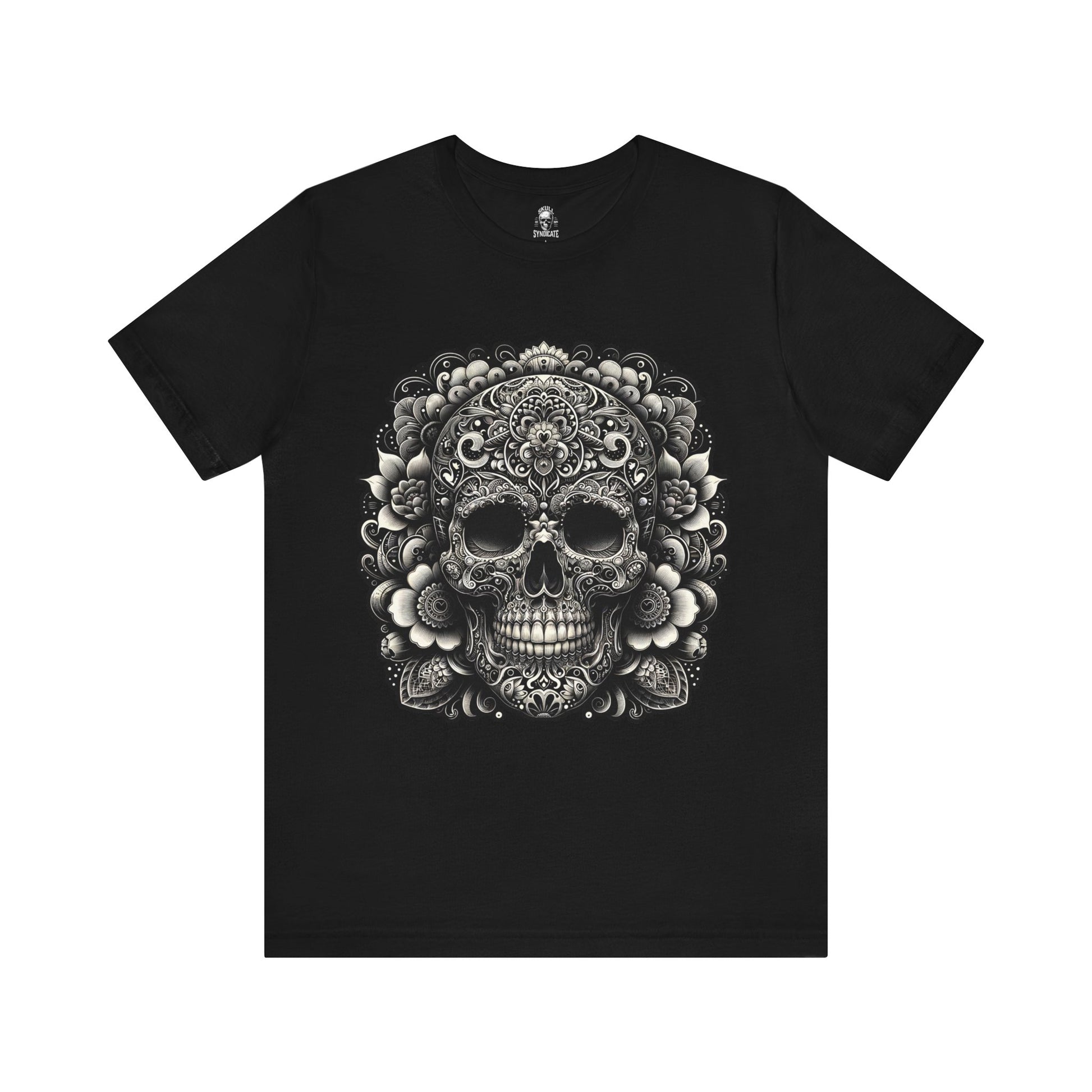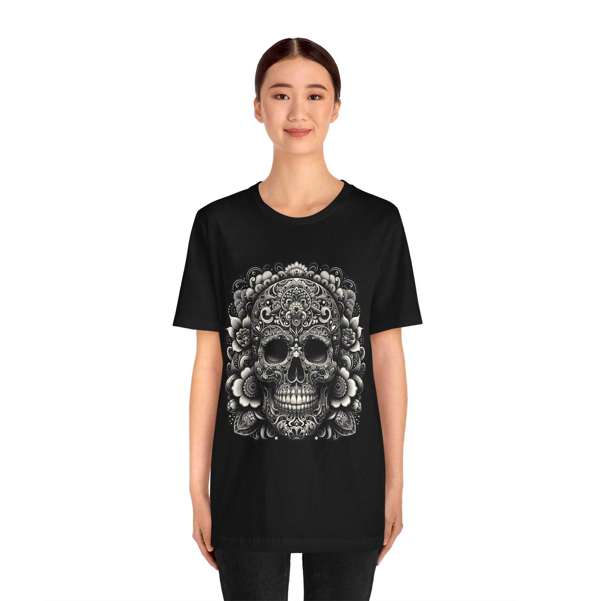 Introducing a masterpiece for skull lovers! This complexly detailed monochrome skull print, steeped in emotion, portrays a seductive intertwine of lustful pleasure. Infused with elements of floral heart motifs, its dark aesthetic, set on a bold black backdrop, is sure to captivate. A must-have piece for any macabre wardrobe! #skullsyndicate #7deadlysins #lust #macabrefashion #skullart #darkstyle #gothwear #sinfulpleasure #monochrome #skulltshirt