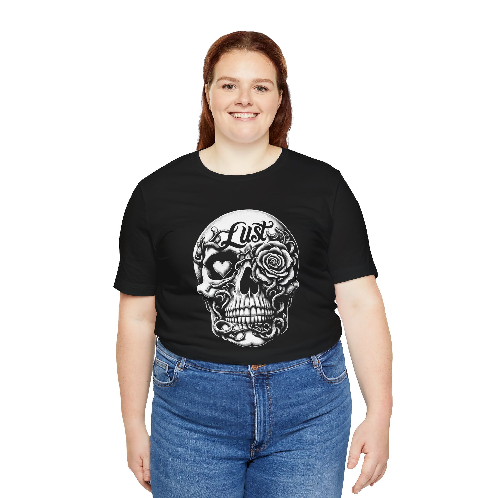 Step into a world where passion and enigma intertwine with "Veiled Desire - Tshirt." This striking monochrome tee captures the essence of lust and fervor, featuring a meticulously detailed skull enveloped in themes of desire and indulgence. Set against a deep black background, the skull is elegantly adorned with hearts and florals, symbolizing the intense blend of sensuality and mortality. This piece is a perfect addition for those who revel in skull-themed fashion, offering a design that is both captivating and enduring. It's not just a garment; it's a bold statement of lustful passion and the fleeting nature of life, artfully rendered in fabric. #SkullSyndicate #7DeadlySins #Lust #MacabreArt #DecadentDesign #GothicGlam #BlackandWhite #SkullStyle #FloralInferno #HeartsAndDeath